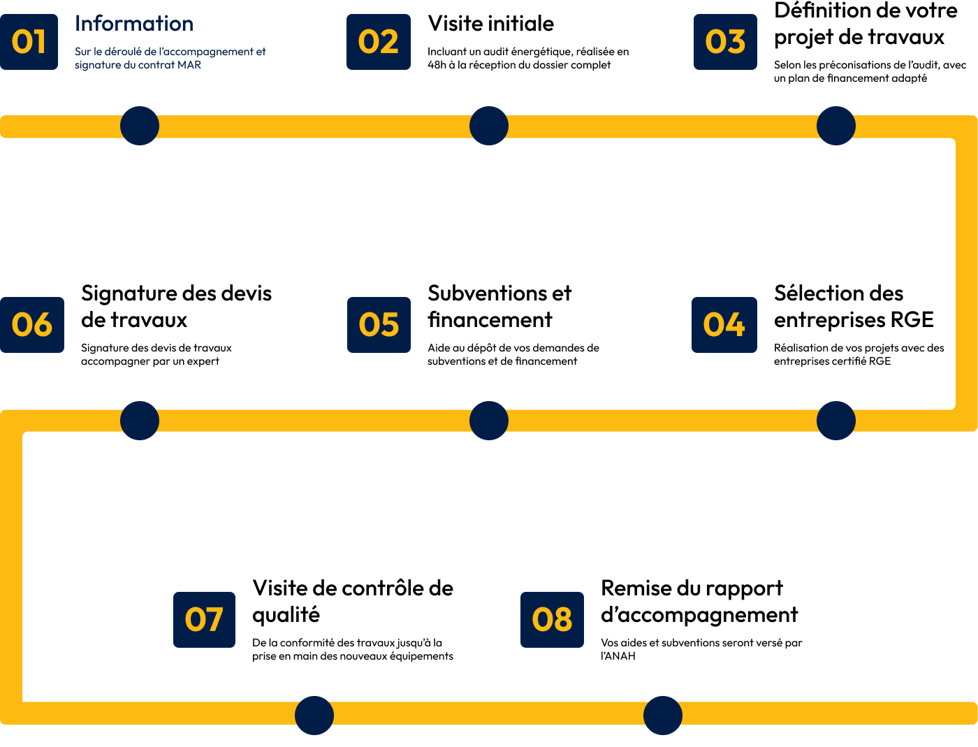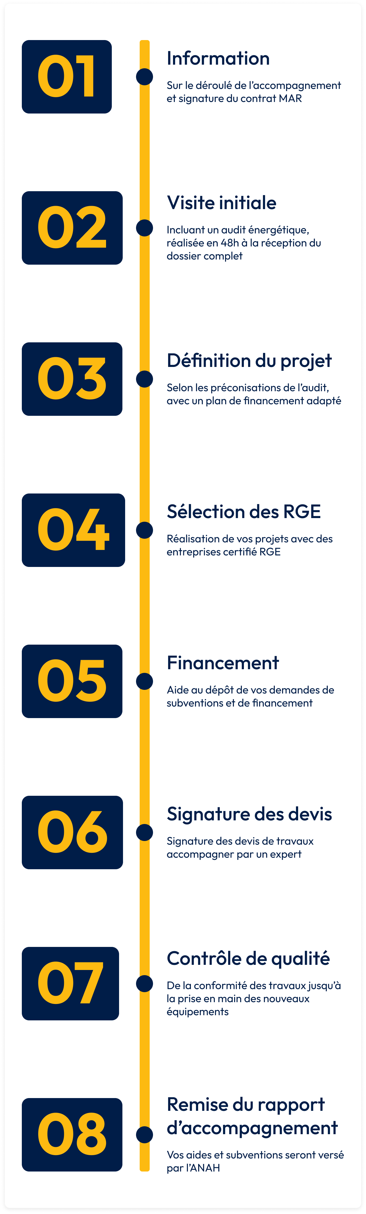 Notre expertise et notre engagement se conjuguent pour transformer votre habitat en un modèle d’efficacité et de durabilité. Avec Mon Accompagnateur Rénov’ (MAR), bénéficiez d’un soutien personnalisé à chaque étape de votre projet de rénovation.